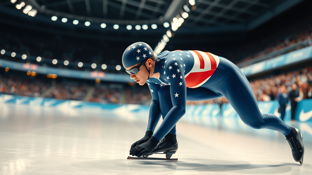 Американский конькобежец Джордан Столз готовится к гонке на 1000 метров на Олимпийских играх в Милане-Кортине