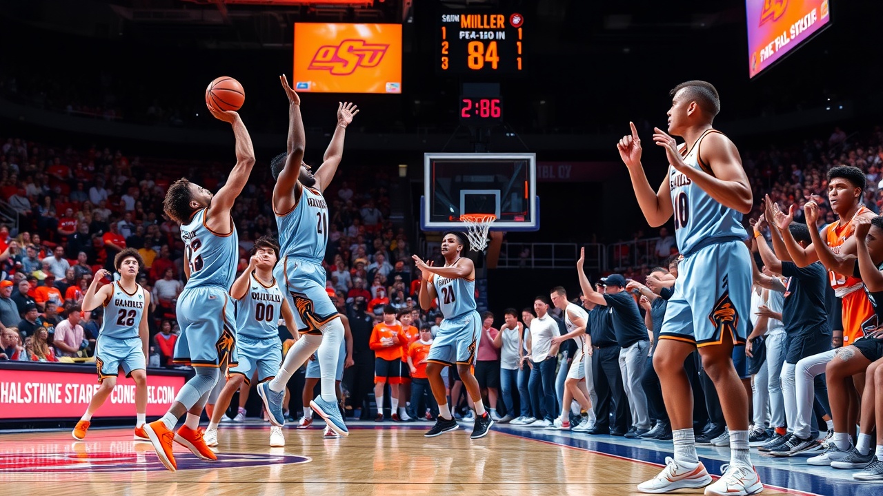 Канье Клэри промахнулся с двух трехочковых подряд, но Миллер обеспечил второй подряд атакующий подбор для Оклахома Стейт в борьбе за мяч за 4 секунды до конца. Затем Миллер поймал передачу из-за боковой линии в углу и был сфолирован.