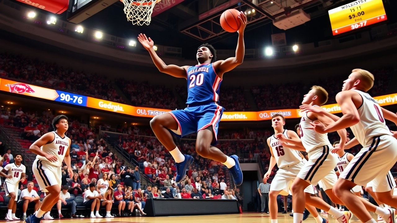 Арканзас отставал 36-55 менее чем через четыре минуты после начала второго тайма, но провел рывок 20-3 за примерно пять минут, сократив отставание Джорджии до 61-62. Арканзас сравнял счет 68-68, когда Дариус Акуфф-младший, ставший лучшим бомбардиром Рейзебэков с 20 очками, забил трехочковый бросок за 6:43 до конца.