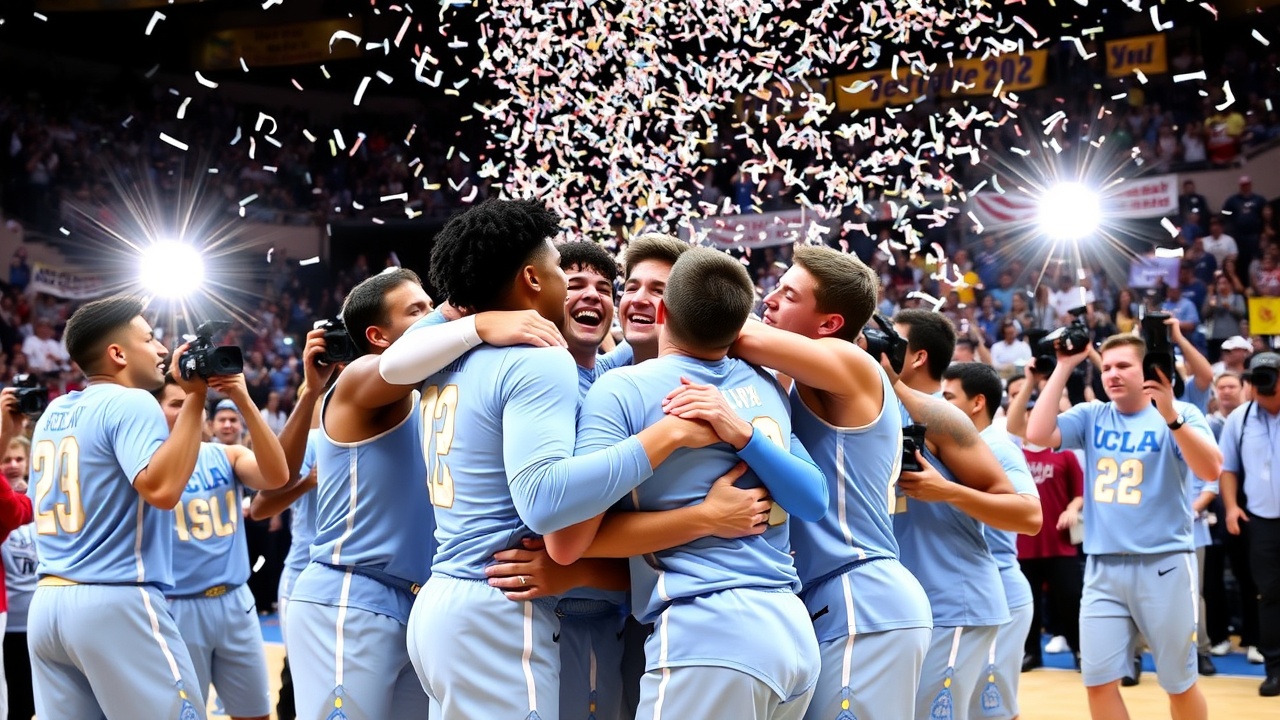 Надев белые майки с титулами, игроки UCLA собрались на центральной площадке в групповой объятии и позировали с трофеем.